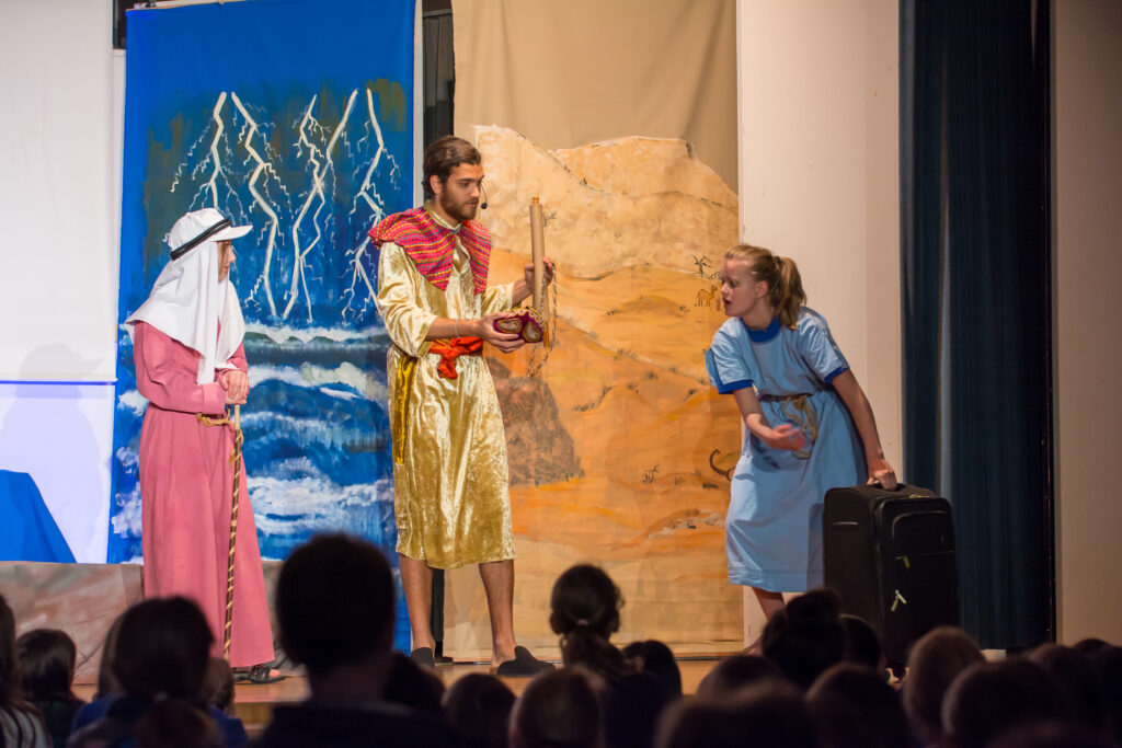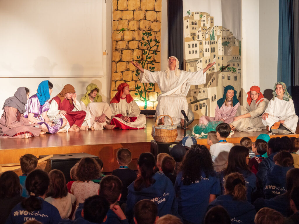 «Kumm und lueg!», war die Aufforderung von Jesus im biblischen Theater, die sich wie ein roter Faden durch die fünf Tage der Kinderwoche hindurchzog. Und zu schauen gab es viel! In der Woche nach Ostern kamen rund 300 Kinder im und um das Wasserstelzen-Schulhaus zusammen, um an der Kinderwoche – kurz KIWO – teilzunehmen. Die KIWO ist ein Tageslager, das von Kirchen, Gemeinden und Werken der Evangelischen Allianz Riehen- Bettingen in Zusammenarbeit mit St. Franziskus organisiert und getragen wird. Das biblische Theater wurde von den Kindern jeden Tag mit Spannung erwartet. So hatten sie Gelegenheit, Jesus zu erleben, wie er seine Jünger beruft und mit ihnen durchs Land zieht. Sie trafen auf Fragen und Situationen, die uns auch heute noch bewegen, etwa wie man betet, wie oft muss man vergeben? Liebt mich Gott? Diese Fragen hat Jesus im Theater mit einem Gleichnis erklärt, das die Schauspieler nach einer blitzschnellen Rollentausch- und Umkleideaktion dargestellt haben. Den vorwiegend jugendlichen Schauspielern unter der Leitung von Matthias Thalmann gelang es, die biblischen Geschichten überzeugend, spannend und mit viel Humor darzustellen.